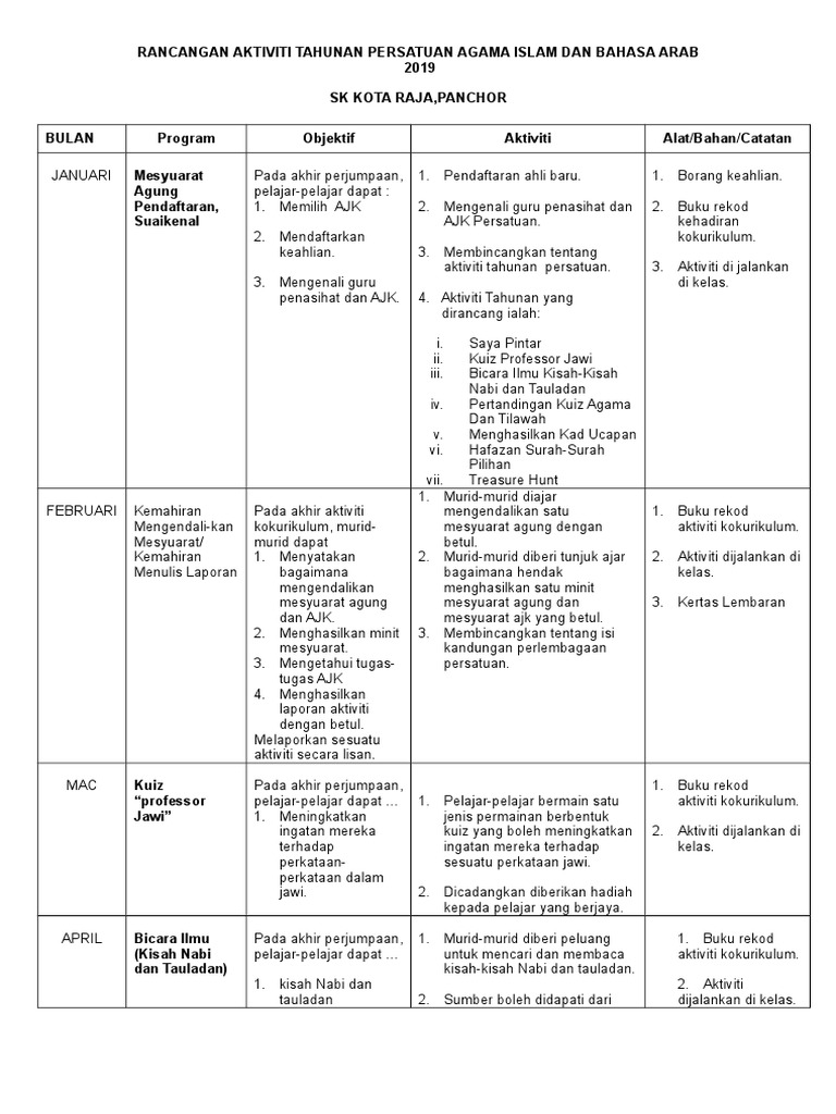 Rancangan Tahunan Persatuan Agama Islam Sk Kota Raja 2019 Pdf